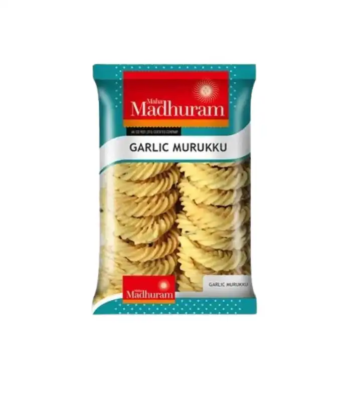 Madhuram Garlic Murukku is a flavorful South Indian savory snack known for its crispy texture and aromatic garlic taste. Prepared using traditional techniques and quality ingredients, this snack delivers a crunchy bite with a savory twist.